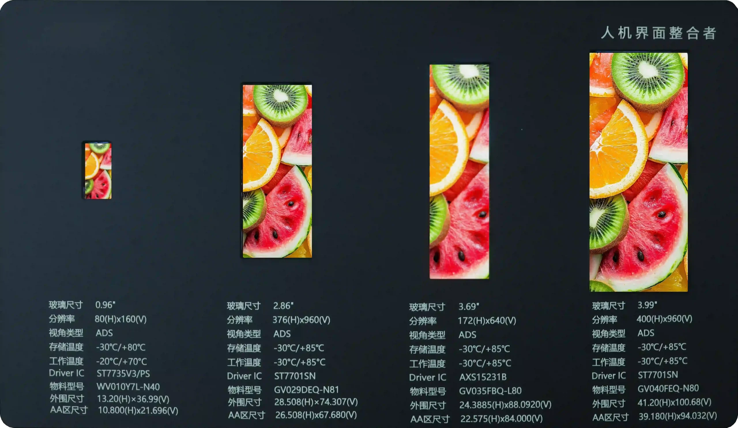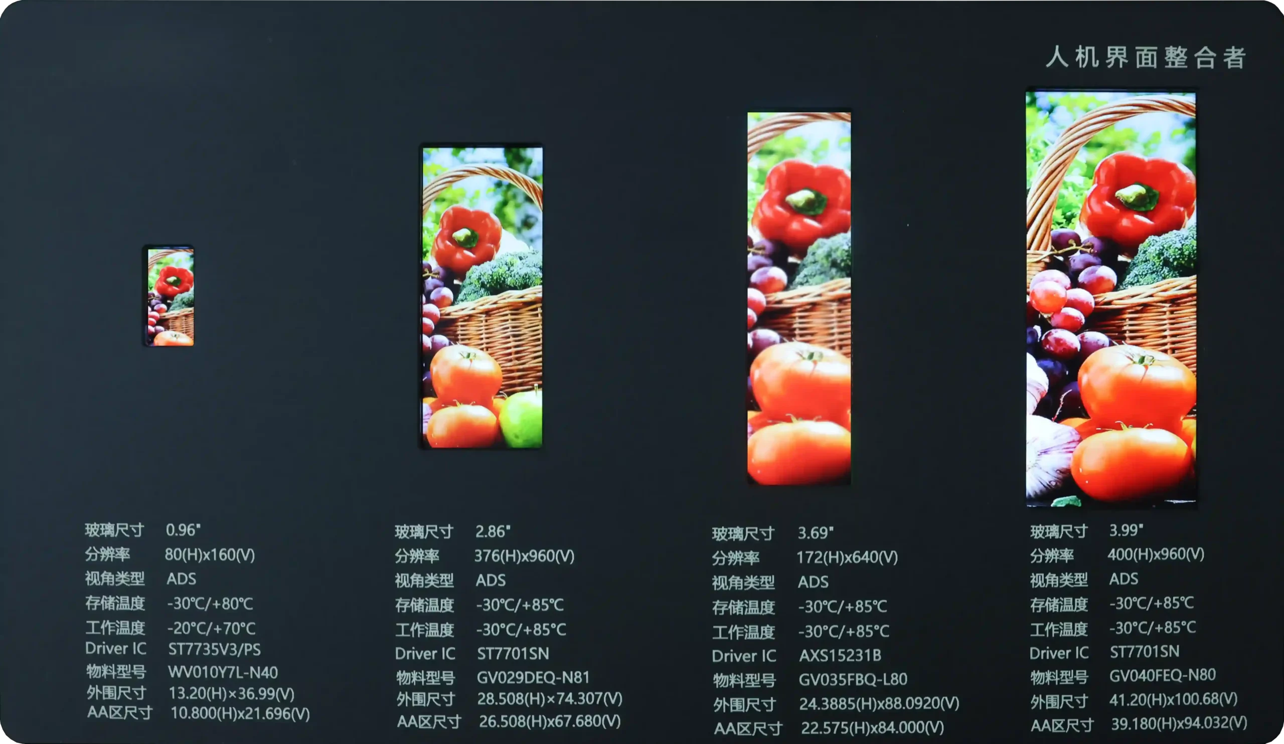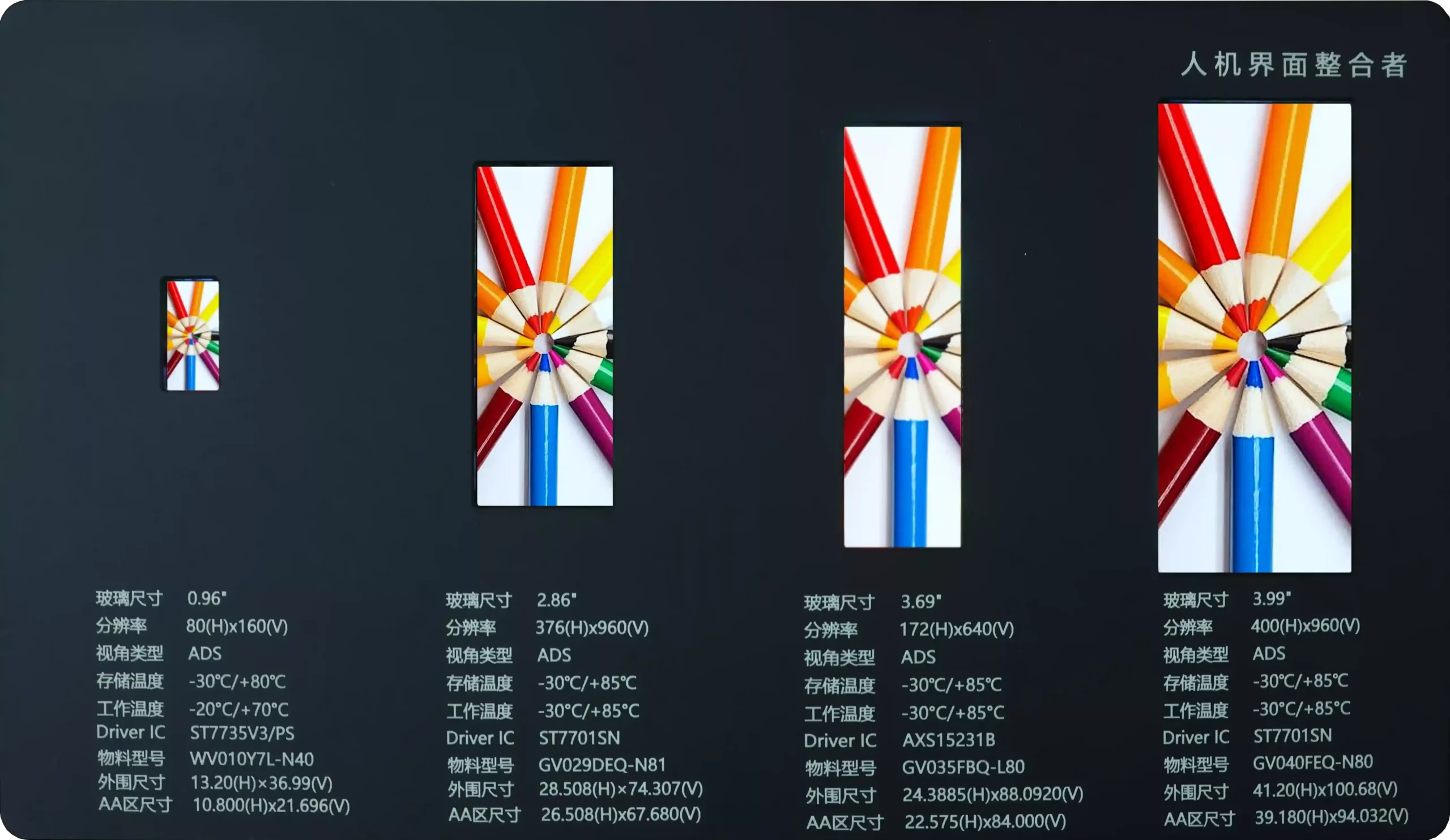 To meet these needs, we introduce four high-performance color LCD screens in different sizes: 0.96 inches, 2.86 inches, 3.69 inches, and 3.99 inches. All utilize advanced ADS wide-viewing angle technology, offering high contrast, low power consumption, and excellent temperature adaptability. They are suitable for a wide range of applications in consumer electronics and smart devices.